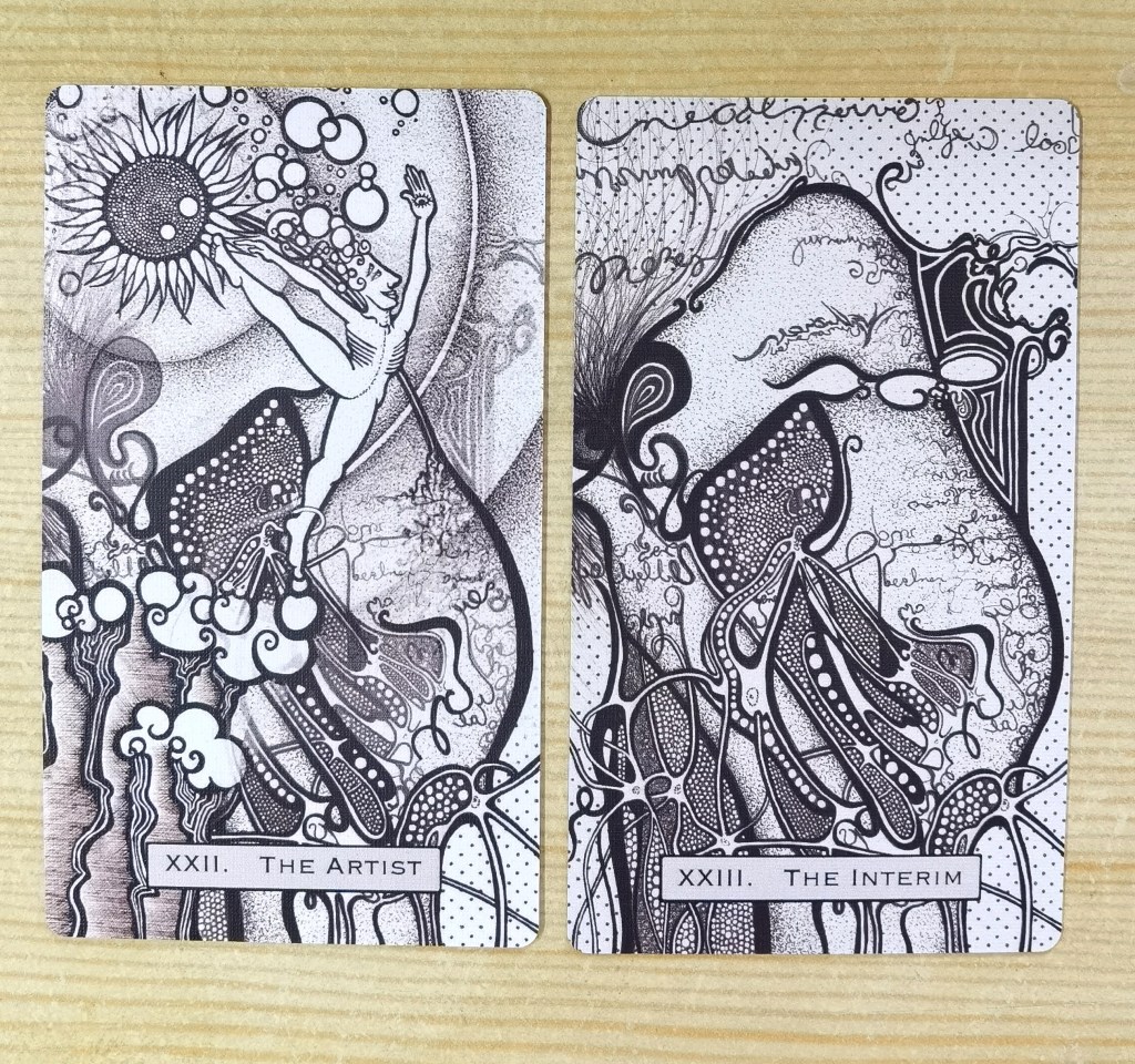 Prior to the 2020 lockdown, Linda enjoyed over a decade career as a massage therapist, a stable compliment to an art practice. The Interim deck is influenced by her experience in bodywork, reiki, and the intelligence of the somatic body, five element theory of the Dao, and acupuncture meridians intersections into connective tissue.