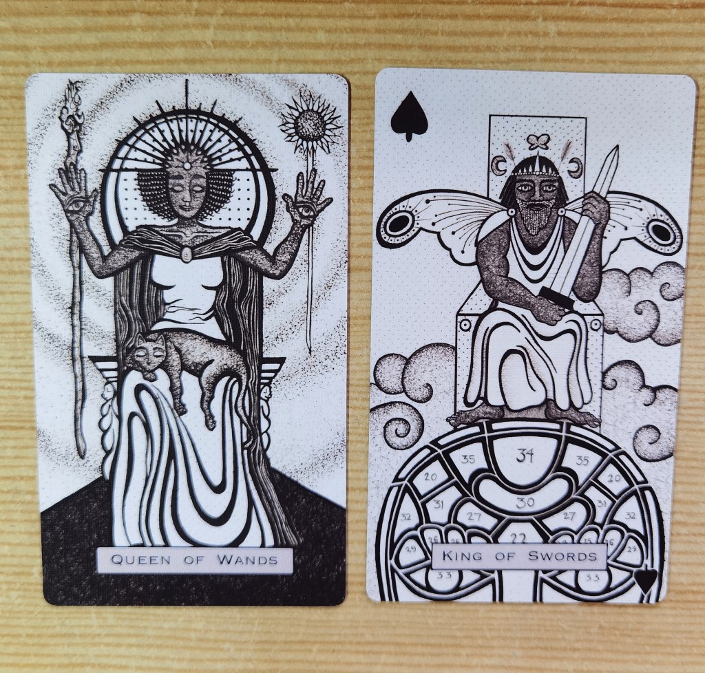 The Interim Tarot is a 80 card Deck. The Cards are printed on 310gsm linen acrylic coated card stock (standard Tarot size).